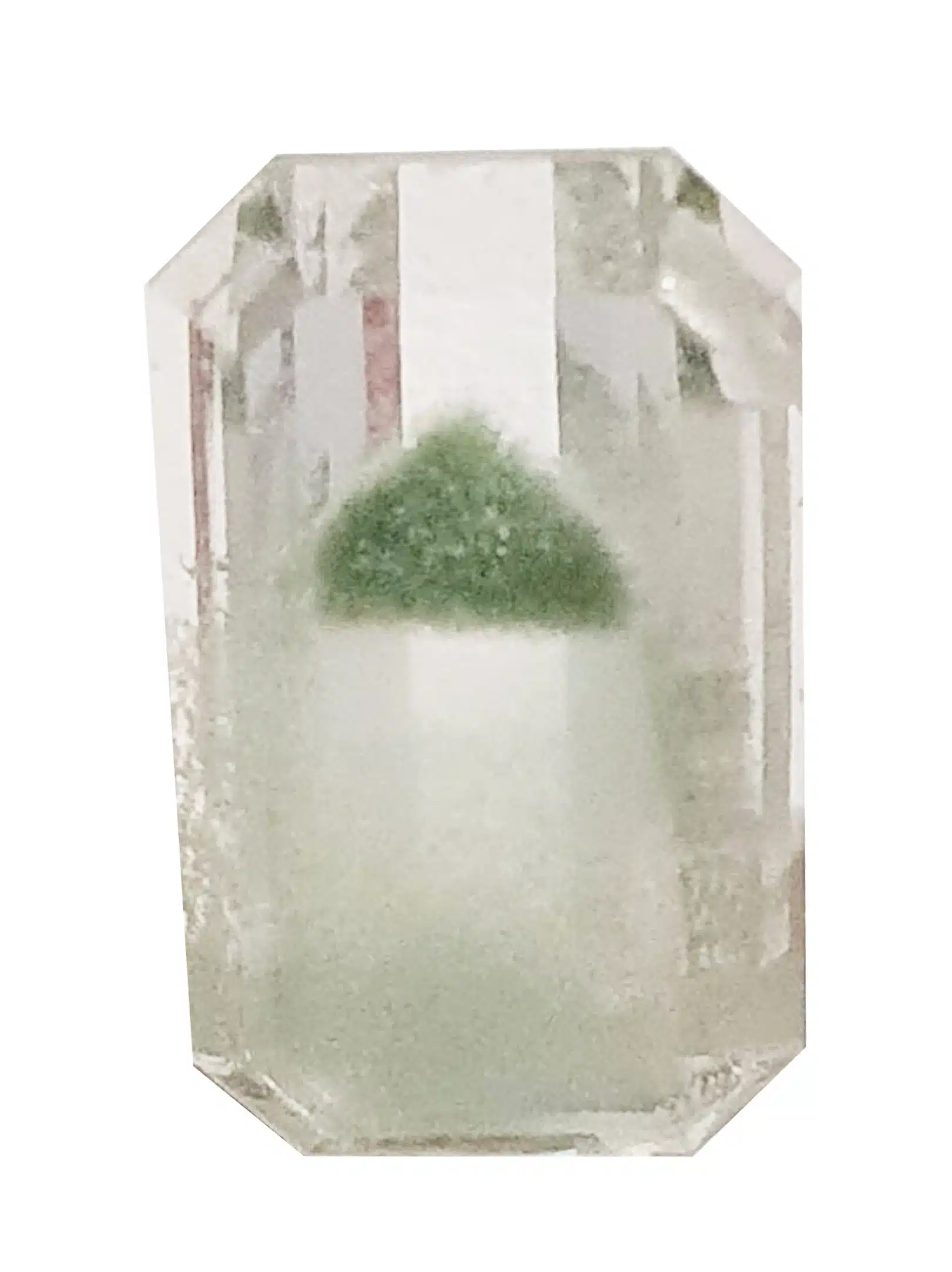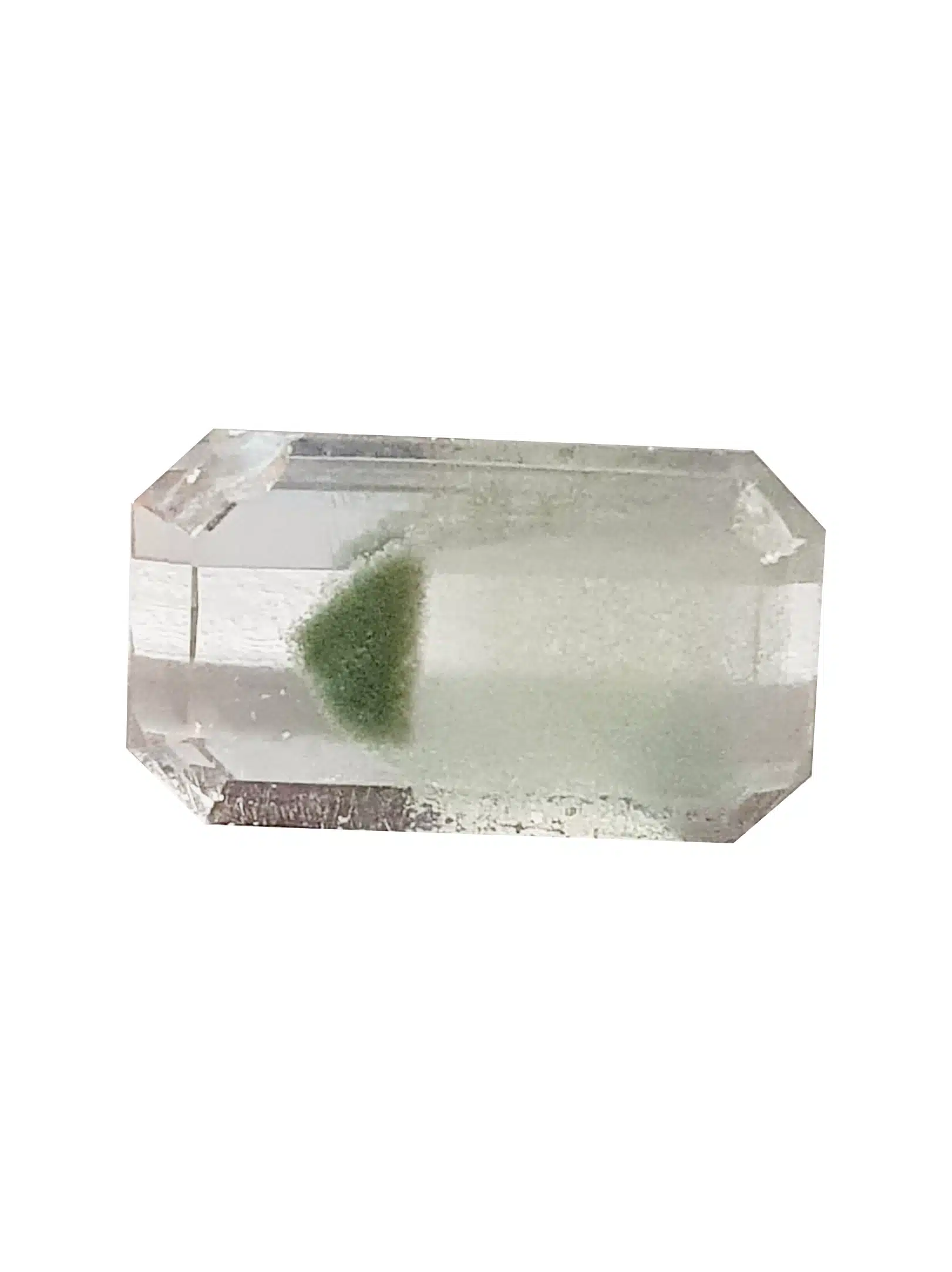 Cette gemme est originaire de Madagascar. Etonnantes inclusions de chlorite qui suit la formation du quartz qui donne le fantôme.